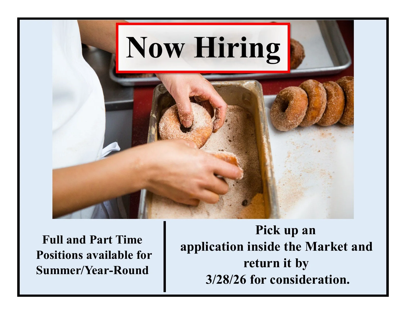 All employees are cross trained work as store clerks, cashiers, produce restocking, and making donuts! Applications must be picked up in person at the Market, they are not available online.