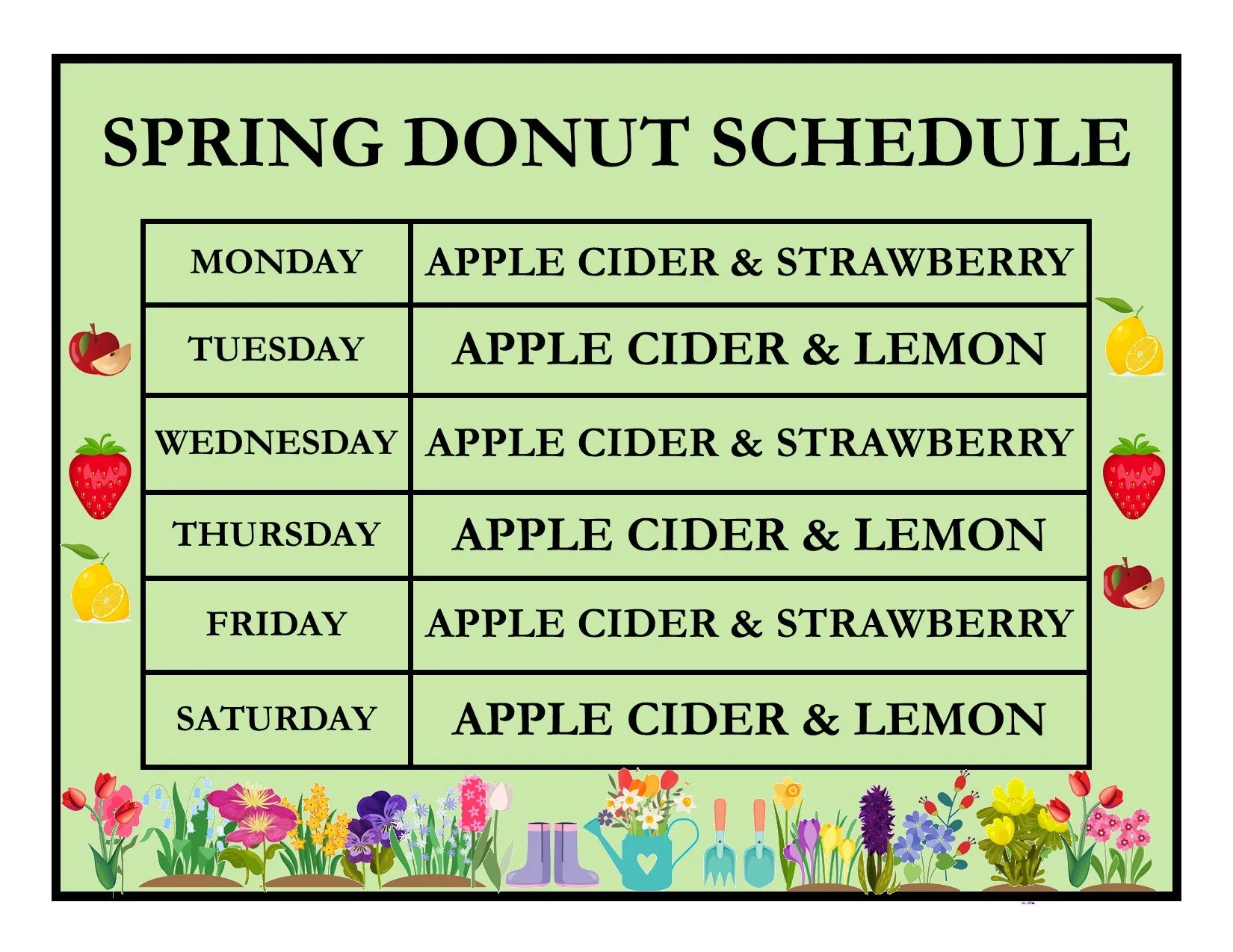 spring 2026 donut schedule apple cider everyday. Strawberry M, W, F. Lemon T, Th, Sat.