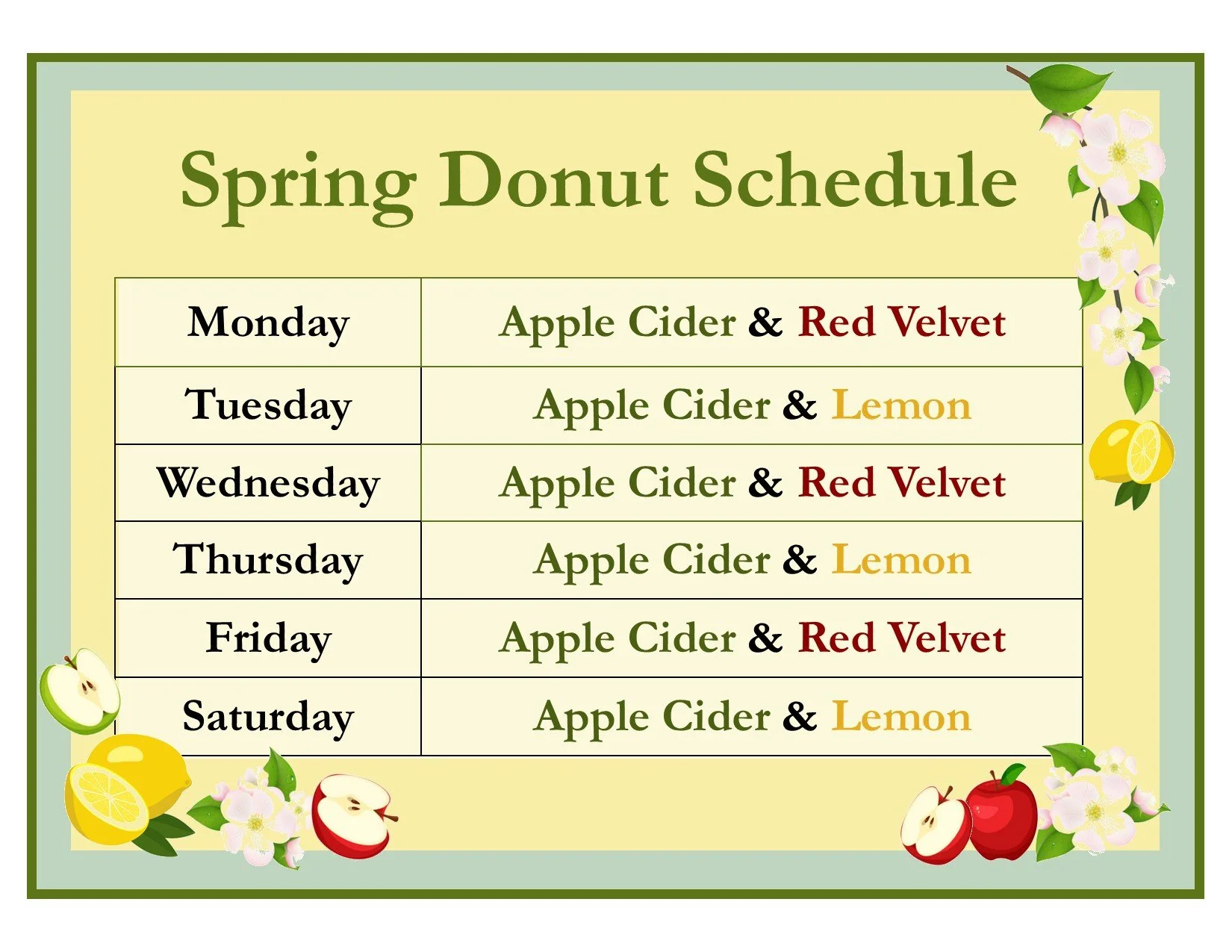 spring 2026 donut schedule apple cider everyday. Red Velvet M, W, F. Lemon T, Th, Sat.